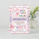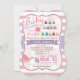 Es ist ein Mädchen! Niedliche, farbenfrohe pastellrosa Baby Stork Baby Dusche Einladung auf pastellrosa und weiße Retro Streifen Muster. Die Ausstattung umfasst rosa, korallenfarbene, gelbe, blaue, grüne, lila, braune, weiße und orangefarbene Kuchen, eine lebhafte rosa und gelbe Blume und einen rosa Storch. Ideal für die mädchenhafte Frühlingssaison Babyduschen! Vintage, elegante Klammer in Form einladen.