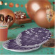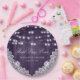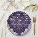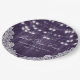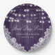 Elegantes rustikales Land lila Hochzeitspapier-Teller mit rustikalem Holz mit weißer Blumenspitze und Lichtern an der Saite.