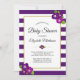 Dieses wunderschöne, einzigartige, moderne Design besticht durch lila Stiefmütterchen vor einem Hintergrund von lila und weißen Streifen in der Königszeit. In der Mitte befindet sich ein vergoldeter weißer Bereich mit dem anpassbaren Text für Ihre Veranstaltung in beliebter, eleganter Typografie. Auf der Rückseite befinden sich individuell anpassbare Registrierungsinformationen innerhalb eines goldgelben Kreises in der Mitte.