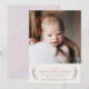 Verkünden Sie die Ankunft Ihres wunderschönen kleinen Mädchens mit dieser einfachen und süßen Geburtsanzeige. Der Name Ihres Babys sowie die Geburtsinformationen werden von einem Kranz aus zarten Blumen und Blättern umrahmt. Der obere Teil des Designs zeigt einen hübschen, geschwungenen Rand. Es gibt auch Platz für ein großes Foto Ihres neuen Familienmitglieds. Die Rückseite der Karte zeigt ein lila, handgezeichnetes Gingham-Muster... Schauen Sie sich auch den passenden, bereits adressierten Umschlag an.