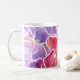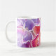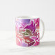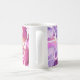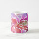 Eine hübsche weiße Tasse mit einem überdachten Design aus einem originellen Aquarellbild mit purpurpurrosa Wandblumen.