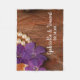 Pearls Country Wedding Fleece Blanket mit den Namen der Braut, Bräutigam und Heiratstermine individuell gestaltet. Diese weiche und schmiedeeiserne Hochzeitsdecke zeigt ein Blumenfoto mit lila Perkeln, Vinca, Blume und einer Perlenhalskette mit verwittertem Stallholzhintergrund. Es ist eine tolle Geschenkidee für einen lässigen und dennoch eleganten Landbauernhof, eine rustikale Scheune, eine Ranch oder Western Verlobungsfeier, Brautparty oder Hochzeit.