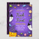 Trick oder Treat Kids Halloween-Party Einladung enthält bunte Halloween-Bonbons, niedlichen Kürbis mit lila Hexenhut gefüllt mit weißen funkelnd Sternen, weiße Geister mit schwarzer Hexenhut und einen lila Hintergrund mit funkelnd weißen Sternen. Auf der Rückseite der Einladung sind glänzende lila und schwarze Streifen zu sehen.