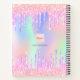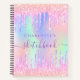 Ein angesagter holografischer Hintergrund mit Einhorn- und Regenbogenpastellfarben in Rosa, lila, Minzgrün. Dekoriert mit Imitaten Tropfen in Rosa und lila. Personalisieren und einen Namen hinzufügen, Der Titel: Sketchbook geschrieben mit einem mädchenhaften modernen handgeschriebenen Stil Skript mit Swashes. Lila Buchstaben. Ein Notizbuch für Zeichnungen, Skizzen, Noten und Hausaufgaben in der Schule.