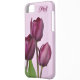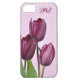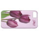 Ein Foto von drei lila Tulpen Burgunders auf einem Lavendelrosahintergrund, mit zusammenpassendem Farbmonogramm oder Initialen, damit Ihr ändert.
