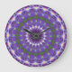 Die lila Iris Kaleidoskop-Uhr entstand aus einem nahen Foto einer bärtigen Irisblüte, die tief lila mit einem leuchtenden, gelben Hals. Auch das Grün des Blattwerks ist Teil des Musters geworden. Es passt in runde oder quadratische Stile.