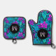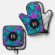 Lila und Aquamarine Blume und Personalisierte Foli Ofenhandschuh & Topflappen-Set