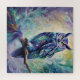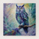Eine fabelhafte Eule mit lila und aquamarinen Federn dringt auf einen Zweig mit lila, grünem und aquamarinem Fantasy-Laub. Wunderschönes Bild, perfekt für alle, die Eulen, Magie und Fantasie Lieben.