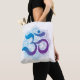 Ein Lila und blaues Farbensymbol im Om-Stil setzt sich über eine sanfte Blume im Mandala-Stil in sanftem Lavendel und Blau. Auf einer weißen Tüte präsentiert. Dieses wunderschöne Design ist auch auf der Rückseite bedruckt. Sättige dich mit dem Om Mantra und werde zum lebenden Gebet! Ideal zum Tragen im Yoga Studio oder fast überall!