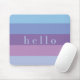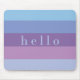 Dieses stylische Mauspad zeichnet sich durch ein trendiges, bunt gestreiftes Muster in einer blauen und lila Farbpalette sowie durch das Wort "hallo" aus.