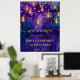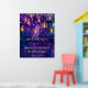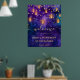 Dieses elegante Design besticht durch eine farbenfrohe Mischung aus tiefen Purpur und Blues, die einen traumhaften Dämmerhimmel hervorruft. Hinter der Decke hängen glühende goldene Laternen, die alle von zarten gepunkteten Ketten hängen und von verstreuten Goldpunkten umgeben sind, die festlichen Glanz und Wärme verleihen. Im unteren Teil der Anlage sind zwei glänzende Silberherz-Verzierungen zu sehen, die eine romantische Touch hinzufügen. Das Gesamtbild ist perfekt für Meilensteine, Hochzeiten, Quinceañeras oder für alle Veranstaltungen, die eine magische, personalisierte Ästhetik erfordern.