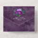 Elegante violette Blumen und grüne Blattwerk Einladung zur Hochzeit mit Vintager, bedrückter Grunge-Damast-Rückseite mit einem whimsical Schmetterling.