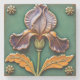Jugendstil-Keramik-Kachel mit Iris-Blume mit lila Blütenblättern und gelben Blätter auf grünem Hintergrund, umgeben von vier kleinen gelben Blumen in den Ecken, Vintager Stil.