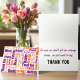 Eine geradeaus bis zur Punktfläche liegende Kartenabdeckung ist mit dieser lila und orangefarbenen mehrsprachigen Dankeschön Wortwolke in verschiedenen Schriftstilen auf weißem Hintergrund entworfen. Füllen Sie das Vorlagenfeld mit der Meldung aus, entfernen Sie den gesamten Text für ein Leerzeichen innerhalb oder klicken Sie auf Anpassen, um eine andere Schriftart, Schriftgröße und Farbe für die innere Nachricht auszuwählen. Beim Anpassen können Sie eine andere Deckungshintergrund-Farbe als weiß auswählen.