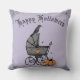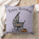Dieses in schwarzer Tinte handgezeichnet, festliche "Happy Halloween" Kissen zeigt handgezeichnet Illustrationen in schwarzer Tinte von Nathalie Portet eines antiken Viktorianischen Babywagens, schwarzer Krähe, Kürbisse und Spinnweben, alles vor einem eleganten lila Hintergrund. Mit bearbeitbarem Text passen Sie Ihr Kissen auf der Produktseite an, indem Sie auf "Diese Vorlage personalisieren" klicken, bevor Sie sie in Ihren Warenkorb aufnehmen.