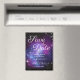 Lila Galaxienhaufen-Foto mit Save the Date einladen mit einem schönen Kalligrafiestil. Die Hauptfarben sind lila, blau, lavender und schwarz mit Weiß. Ein kleiner rechteckiger Foto-Magnet für das Speichern der Daten.