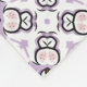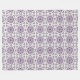 "Zwei Bilder mit einem Handtuch und Waschlappen mit einem sich wiederholenden geometrischen Blumenmuster in Lila und Schwarz. Das Handtuch hängt an einer Stange, der Waschlappen liegt flach mit einer umgeschlagenen Ecke. Das Muster vermittelt einen eleganten, dekorativen Ton."