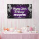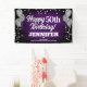 Ein lustiges Bannerzeichen für innen oder außen mit festlich silberfarbenen Metallballons auf beiden Seiten des Designs mit funkelnd, silbernen Metallkonfetti auf einem reich strukturierten lila Hintergrund für Ihr personalisiertes Geburtstagsbanner. Dieses Produkt verdoppelt sich als wunderbarer Meilenstein-Geburtstagssicheres.