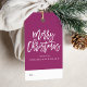 Geben Sie Ihren Urlaubspaketen mit modernen Geschenketiketten einen besonderen Stellenwert. Die individuellen Weihnachtsgeschenke-Tags sind mit "Frohe Weihnachten" in einem trendigen Script-Schriftart, lila Hintergrund und einem Kiefernmuster auf der Rückseite des Designs ausgestattet.