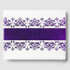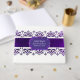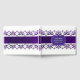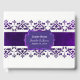 Elegantes Gästebuch in Weiß mit einem lila Damast-Muster und einem lila satin aussehenden Band, in der Mitte. Ein lila, dekorativer Plakattext mit weißem, individuellem Text für Ihren besonderen Tag.