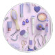 Eine lila Anordnung von Gegenständen, die auf einem Eiteltisch zu finden sind, wie Pinsel, Cremes, Kamera, Parfüm, Schmuck, Pinsel und so weiter.