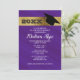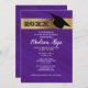 Lila violette Graduation Party Einladung mit einem goldenen Streifen und einem schwarzen Graduierdeckel.