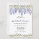 Romantisches Blumendesign mit lila und blauer Wisteria, die sich anmutig über den Weinberg zieht. Die Weinrebe und nur wenige Blume bilden den Rahmen der Einladung. Auf der Rückseite der Brautdusche befinden sich die beiden gleichen Ränder. In der Mitte befindet sich ein Wisteria-Kranz mit den Namen der Ehepaare. Auf der Rückseite ist ein lila-blauer Hintergrund, vorne weiß. Sie können diese Farben auch ändern, um sich mit Ihrer Hochzeitsdekoration abzustimmen.