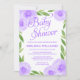 Whimsical Aquarell Baby Dusche Einladungen. Das Design umfasst lila Aquarellfarben-Blume und grüne Blätter. Ein niedliches Design für ein kleines Mädchen unterwegs.