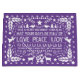 Lila und weiße Liebe, Friede, Joy Papel picado Weihnachtsfeiertag geschmiedet große Geschenktasche. Es zeigt einige Weihnachtselemente wie eine minimale Krippe, Weihnachtsbäume und Hirsche, Engel und Tauben und den Text "Liebe, Frieden und Freude" "Glaube" und "Fa la la la la la la la la la la la la la la la la la" in Weiß. Es enthält auch Blume und Punkte. Diese Karte ist im mexikanischen Stil der Volkskunst.