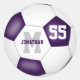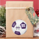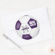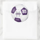 Diese farbigen, runden Fußballaufkleber für ein Mädchen oder einen Jungen sind mit einer einfachen Fußball-Grafik mit lila und weißen Tafeln versehen, die mit dem Namen des Athleten, dem Monogramm und der Jersey-Nummer abgestimmt sind