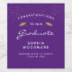 Feiern Sie den Meilenstein Ihres Absolventen stilvoll mit diesen individuellen Abschluss Weinflaschen Etiketten, mit den Worten "Herzlichen Glückwunsch an unseren Absolvent" in weißem Text auf einem lila Hintergrund. Das Wort "Graduate" erscheint in einem anmutigen Skript im Handschriftenstil. Ein paar goldene Imitate Glitzer Mörtel-Kappen und eine Streuung von Goldkonfetti schmücken den oberen Teil des Etiketts. Personalisieren Sie es mit dem Namen, der Schule und dem Jahr des Abschlusses.