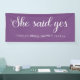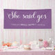 Niedliches lila und weißes Brautparty-Banner mit Text in einem niedlichen, kursiven Skript-Schriftart: "Sie sagte ja." Personalisiert mit dem Namen der Braut und ihrem Duschdatum.