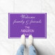 Willkommensfamilie und Freunde sind in weißem Schriftsatz geschrieben. Hübscher violetter Hintergrund mit weißem geometrischem Rahmen. Geben Sie Familiennamen in lila Farbtypografie ein. Klicken Sie auf Schriftart-, Hintergrund- und Textfarben anpassen und ändern. Original Designs von TamiraZDesign.