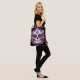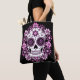 Dia de los Muertos Zuckerschädel in bunten Farbtönen von lila, umgeben von Blume.