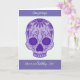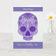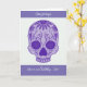 Lila Tag des Toten Stils Zucker/Bonbonschädel mit "Grimische Grüße, haben einen coolen Geburtstag" Nachricht an der Vorderseite. Design würde einen jungen Goth, Horror oder Grunge-Fan Anzug. Fügen Sie Ihre eigene Nachricht hinzu.