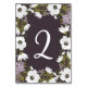 Individuell anpassbare Tischnummern-Karte mit weißen, lila und lavender Blume und modernem Kalligrafiebeschreiben. Dies ist Teil einer Hochzeitssuite "ANEMONE BLOOMS" - passende Artikel sind verfügbar.