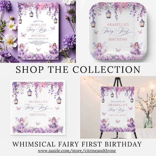 Feiern Sie den magischen 1. Geburtstag Ihres Kleinen mit dieser bezaubernden "Fairy First" Geburtstagseinladung! Schöne lila und violette Blumen, hängende Laternen, Schmetterlinge und skurrile Feen schmücken diese Meilenstein-Einladung. Laden Sie Ihre Gäste ein, sich dem Zauber anzuschließen, während Sie diesen unvergesslichen ersten Geburtstag feiern!