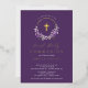 Schöne Einladungen mit einem Lavendel-Kranz und Goldfolie-Kreuz-Set auf einem lila Hintergrund. Dreh unsere Einladung, um einen koordinierenden Rücken für eine besondere Touch zu sehen.