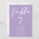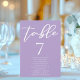 Diese wunderschöne lila Hochzeitsfeier-Tischnummer zeigt eine wunderschöne, weiße Typografie der Gästennamen auf einem sanften lila Hintergrund für eine Frühjahrszeremonie am Nachmittag. Die pastellfarbene Lavendel-Dekoration ist eine delikate Farbwahl für einen eleganten Gartenaufenthalt.