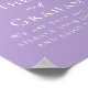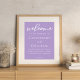 Dieses wunderschöne lila Hochzeitsgeschenk-Poster besticht durch eine wunderschöne weiße Typografie auf einem weichen lila Druck für eine Frühjahrszeremonie am Nachmittag. Die pastellfarbene Lavendel-Dekoration ist eine delikate Farbwahl für einen eleganten Gartenaufenthalt.