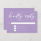 Diese schöne lila Hochzeitskarte RSVP zeigt eine wunderschöne weiße Typografie auf einem weichen lila Hintergrund für eine Frühlingsnachmittagsfeier. Lavender Pastellfarben sind freundlich Antwortkarten, die eine delikate Farbwahl für einen eleganten Gartenevent darstellen.