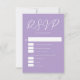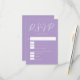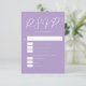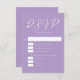 Diese schöne lila Hochzeitskarte RSVP zeigt eine wunderschöne weiße Typografie auf einem weichen lila Hintergrund mit Ihren Mahlzeiten für eine Frühlingsnachmittagsfeier. Lavendel Pastellkarten sind eine delikate Farbwahl für einen eleganten Gartenbesuch.