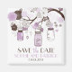 Eine niedliche und skurrile Illustration von lila und braun Masongläsern, Livebirds, Blume und Herzsaiten, die alle an Baumzweigen aufgehängt sind. Diese lustige und romantische speichern Sie das Datum Magnet ist perfekt für eine Sommer-oder Frühling Hochzeit.