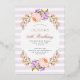 Erschwingliche, individuell bedruckte 30. Geburtstagsbrunch-Einladungen personalisiert mit Ihren Veranstaltungsdetails. Dieses hübsche botanische Design besticht durch einen Aquarellrahmen aus Pfirsich- und Lavendelholz-Blume auf einem pastellfarbenen lila gestreiften Hintergrund. Verwenden Sie die Designtools, um den Text anzupassen, bearbeiten Sie die Schriftart und Farben oder fügen Sie Ihre eigenen Fotos zu einer eleganten Frühjahrsflora Geburtstagsfeier Einladung.