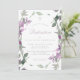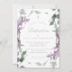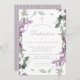 Eine schöne Blumen-Widmung Einladung für ein kleines Mädchen. Dieses Design zeichnet sich durch einen Rahmen aus lila Aquarellfarben-Wildblumen, grünen Blätter und einem Kreuz aus. Der Text ist lila und grau Schriftart. Die Rückseite ist in Volllila mit senkrechten weißen Streifen.