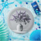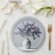 Eine zeitgenössische Vase mit lila lila Blume und silberfarbenem Blattwerk ist elegant auf einem schlichten grauen Hintergrund angeordnet
