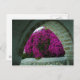Helle, violette Blumen, die durch einen alten Bogen betrachtet werden.