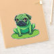 Niedlicher grüner Mops, der einem Frosch ähnelt, der auf einem Lilipad sitzt. Die Hintergrundfarbe kann geändert werden.