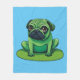Niedlicher grüner Mops, der einem Frosch ähnelt, der auf einem Lilipad sitzt. Die Hintergrundfarbe kann geändert werden.