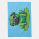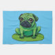 Niedlicher grüner Mops, der einem Frosch ähnelt, der auf einem Lilipad sitzt. Die Hintergrundfarbe kann geändert werden.